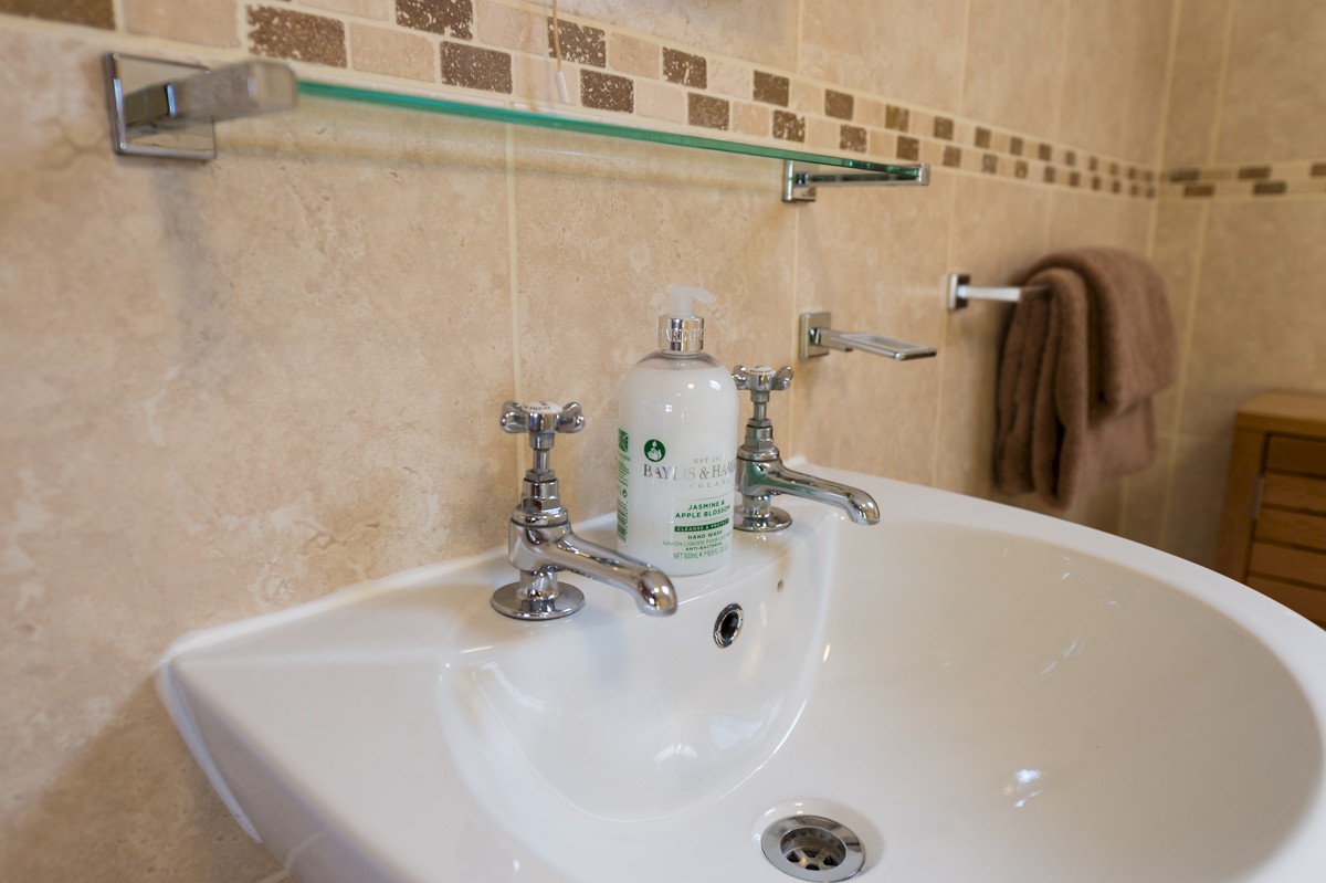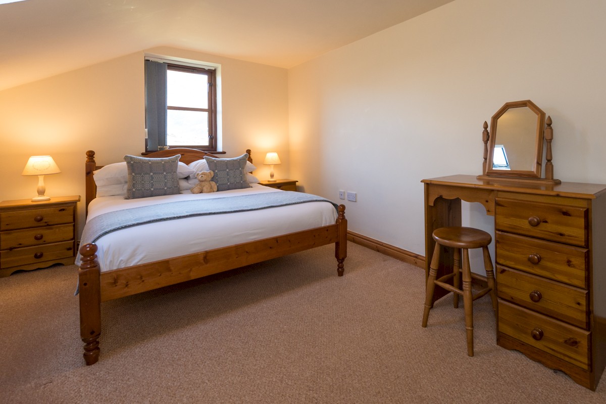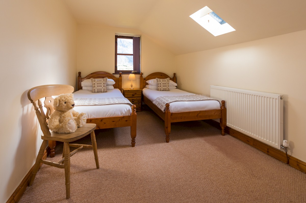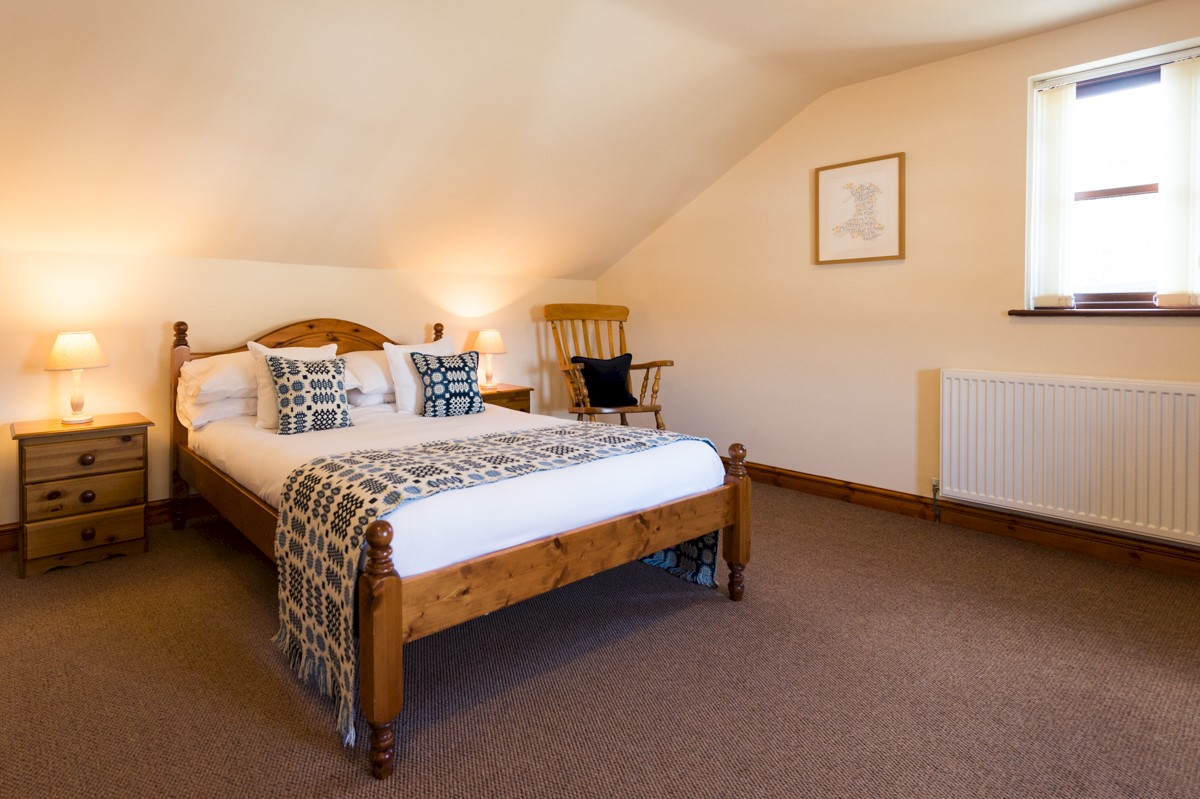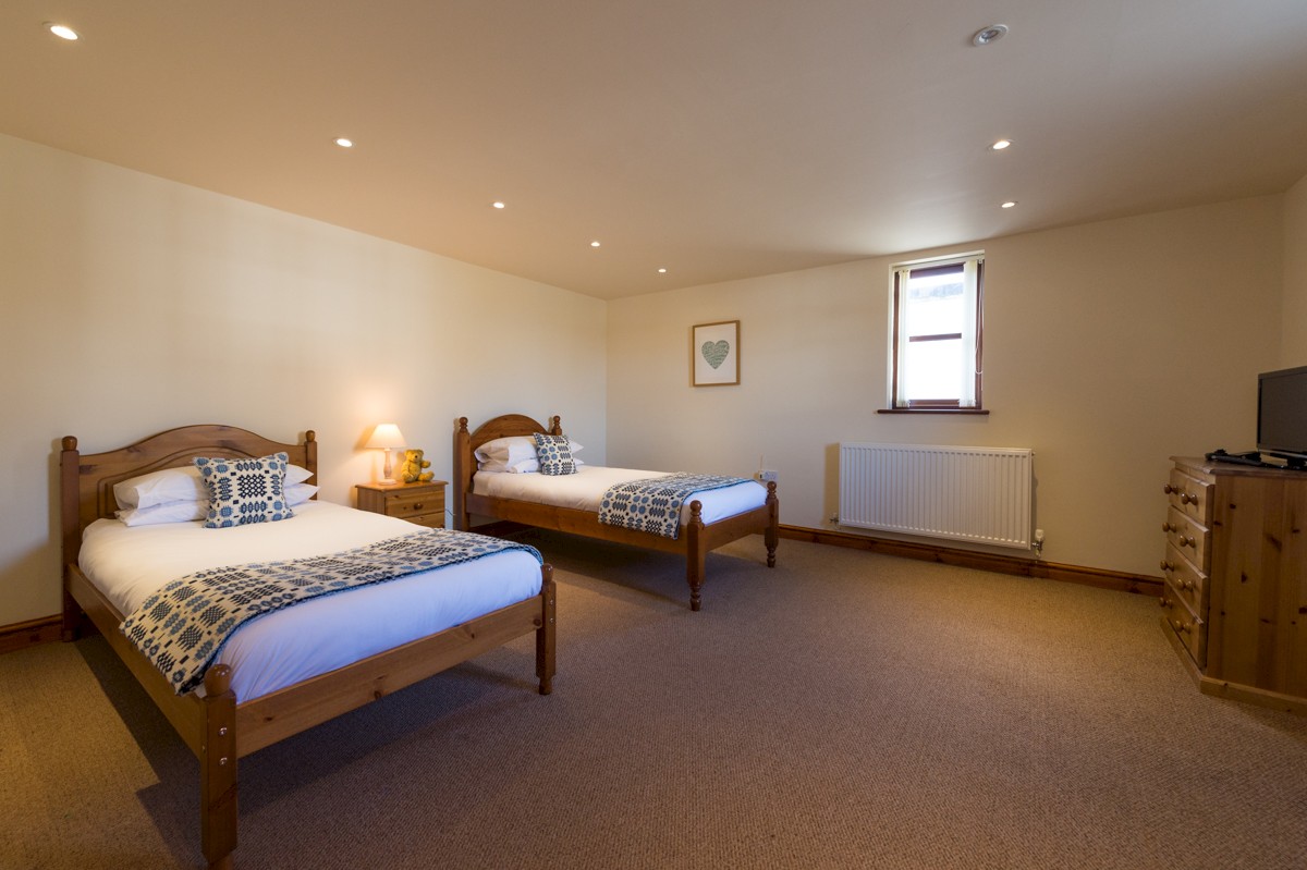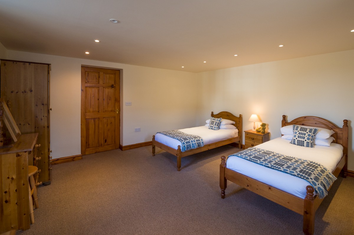 An open tread wooden stair case and suspended walkway leads to the upstairs living space – 2 double bedrooms, 1 twin bedroom and a large family bathroom. A further spacious twin bedroom and shower room downstairs are perfect for guests who prefer to be on the ground floor.