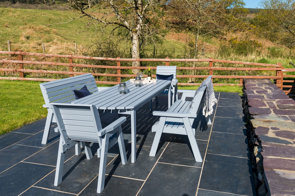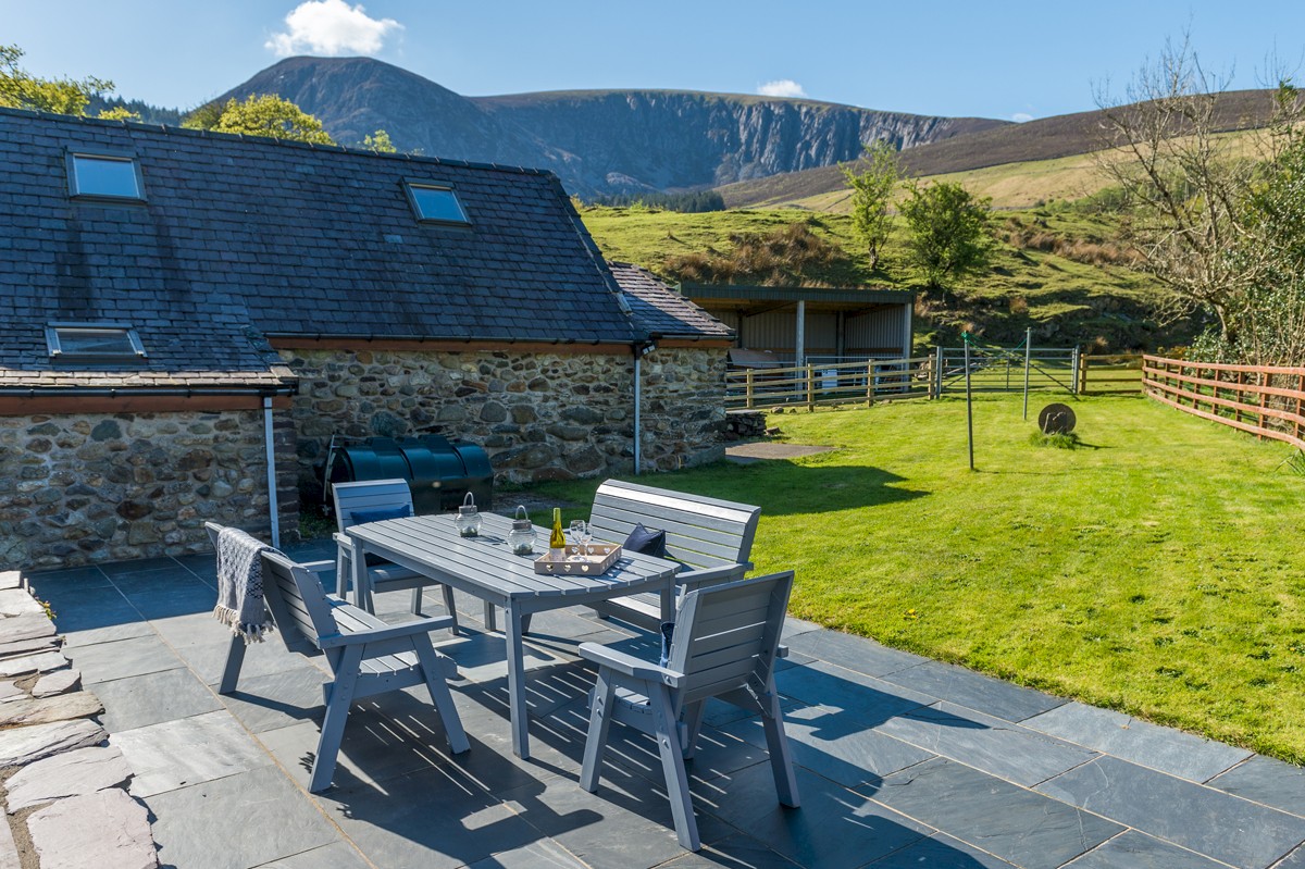 The large enclosed garden (with an unfenced stream running through it) to the rear of the farmhouse is secluded and tranquil, with a patio area and outdoor furniture it is a lovely peaceful space to dine outdoors on a warm summers evening.